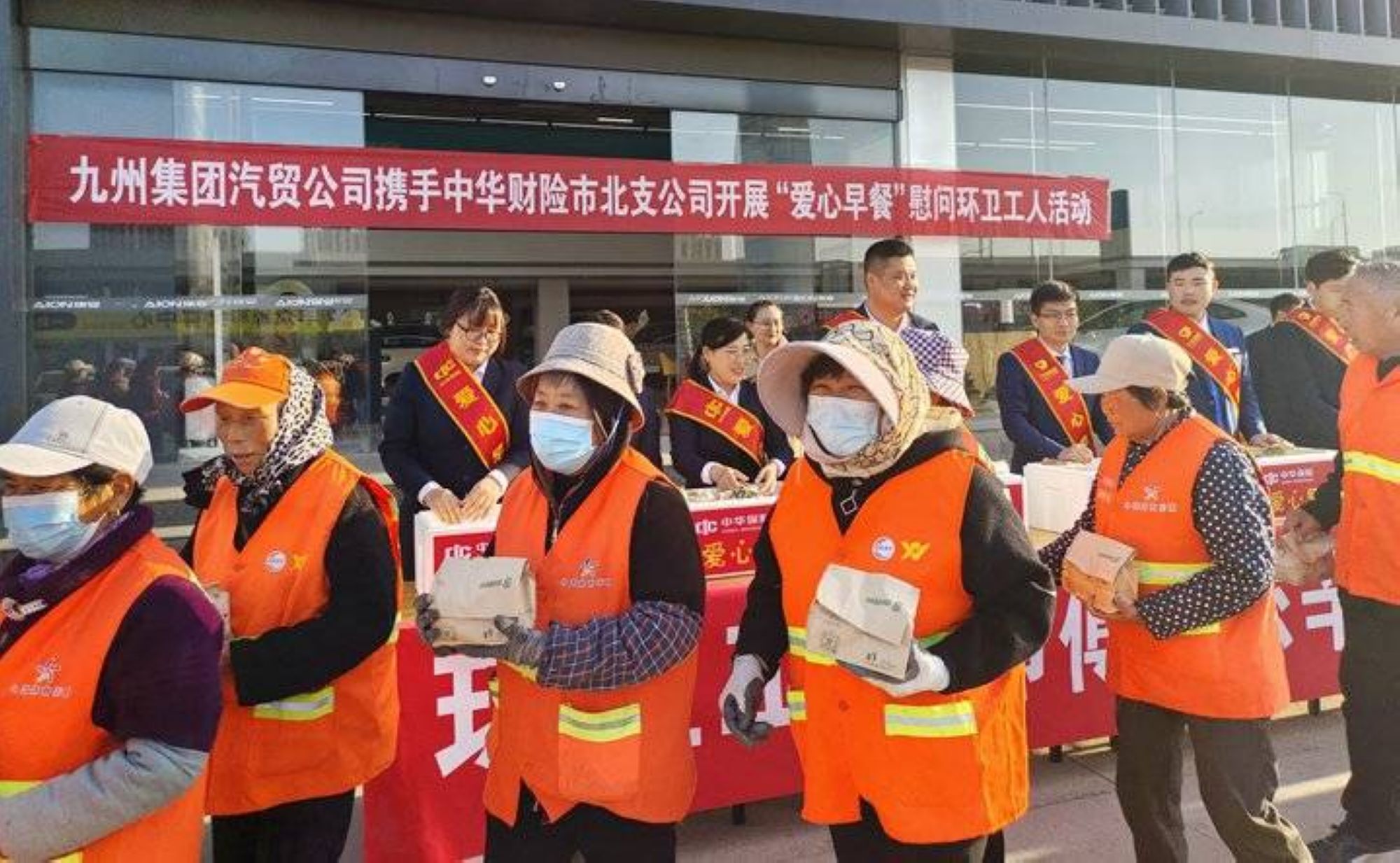 4月15日早上,九州汽貿(mào)攜手中華財險市北支公司在九州埃安4S店門前廣場開展了“愛心早餐”慰問環(huán)衛(wèi)工人活動,為“喚醒城市的美容師”送上了春日清晨的第一份溫暖。