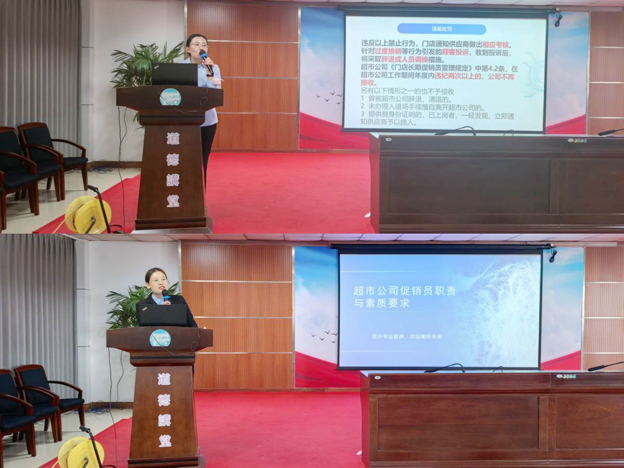 本次培訓由購物中心河東店助理張玉霞、購物中心齊魯園店助理李建梅擔任主講師,重點圍繞九州企業(yè)文化宣貫、促銷員職責與技能、禮儀素養(yǎng)與服務(wù)規(guī)范等方面展開。培訓過程中,講師結(jié)合賣場真實案例,生動形象地講解了促銷員在工作過程中的行為規(guī)范。