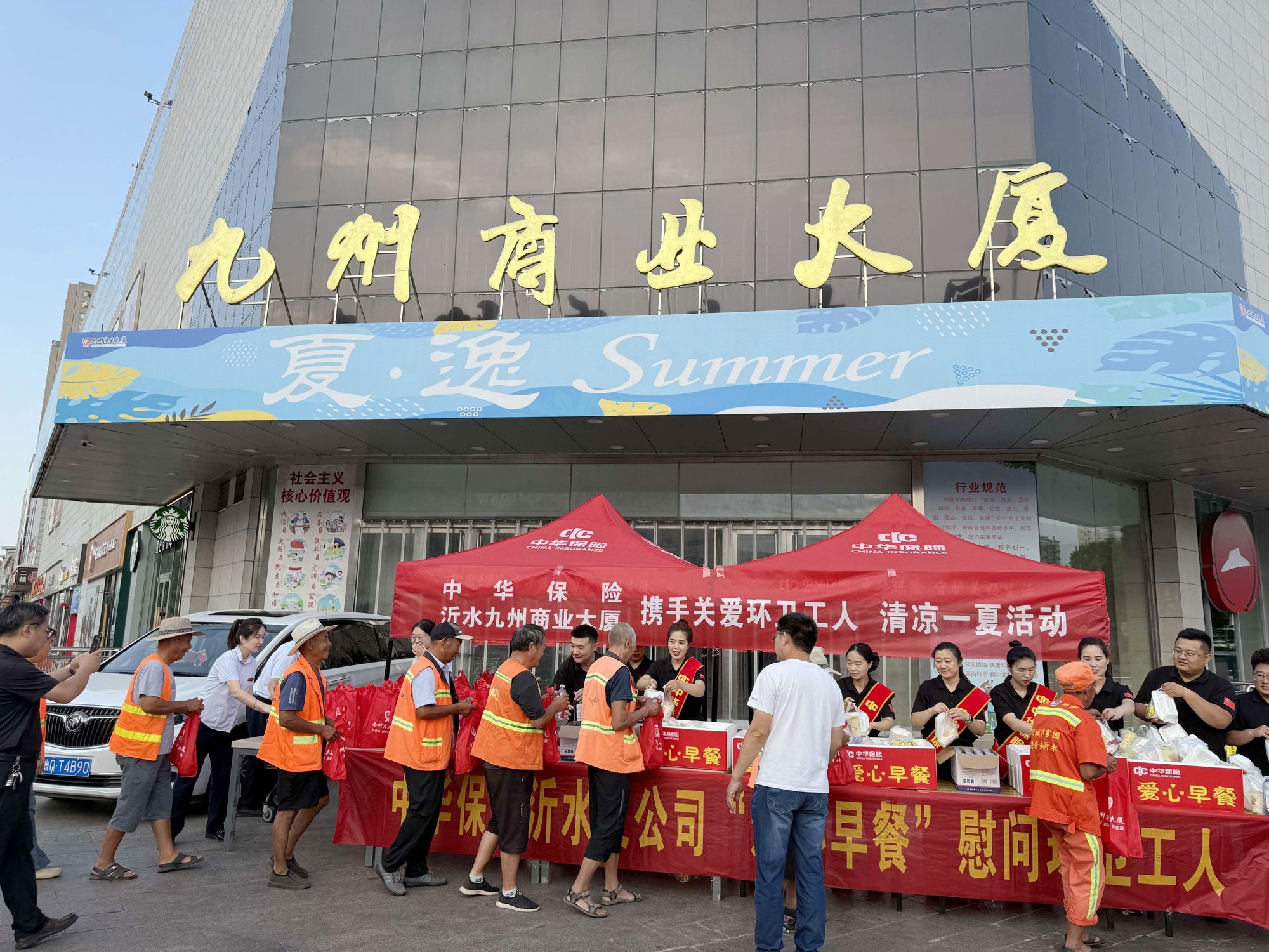 7月15日早上,九州商業(yè)大廈沂水門店攜手中華保險公司,在長安店門前廣場聯(lián)合開展了“攜手關愛環(huán)衛(wèi)工人 清涼一夏”公益活動,為150余名一線環(huán)衛(wèi)工人發(fā)放早餐與清涼禮包,在炎炎夏日為城市的“美容師”送去清涼與關懷。