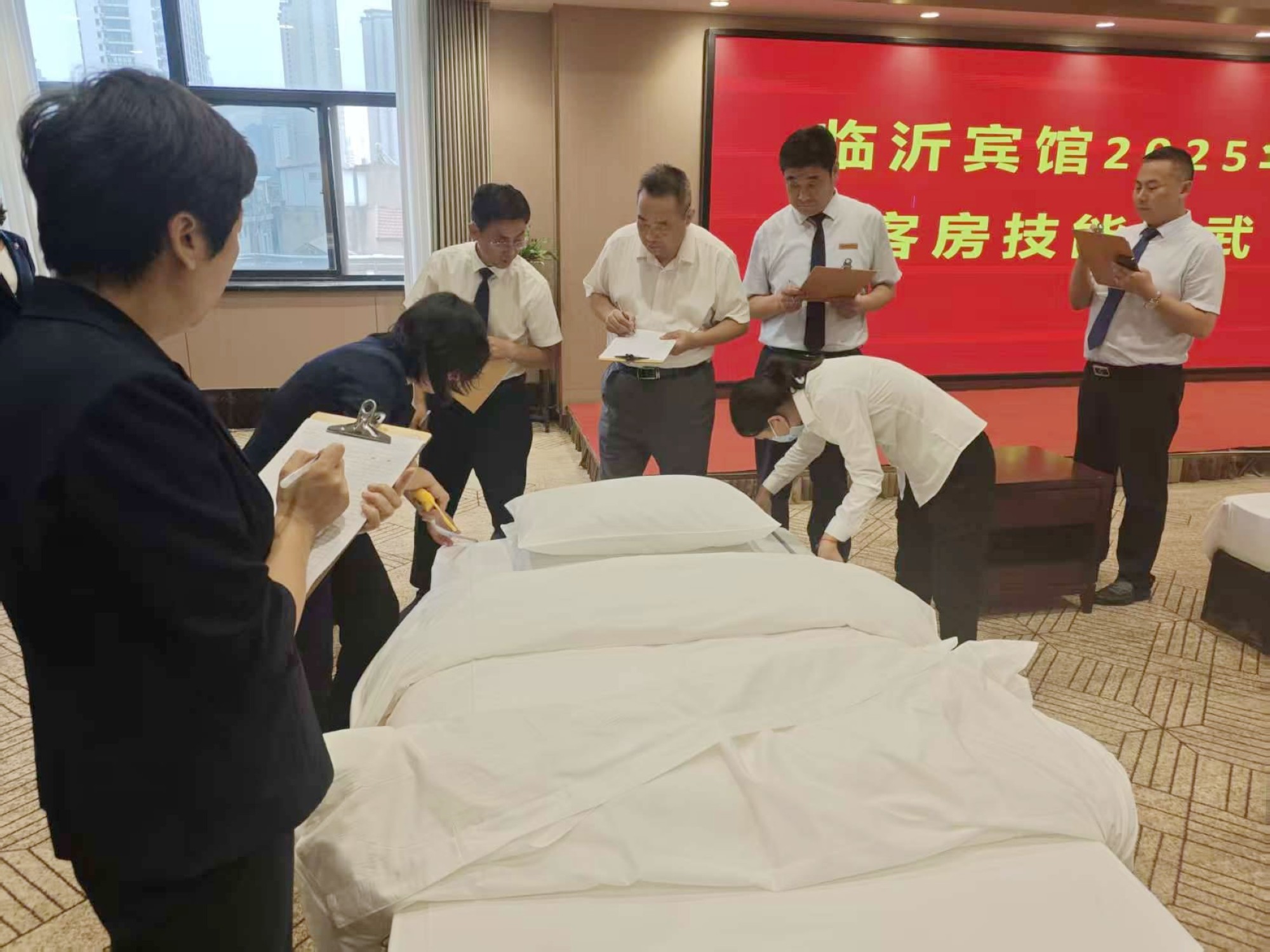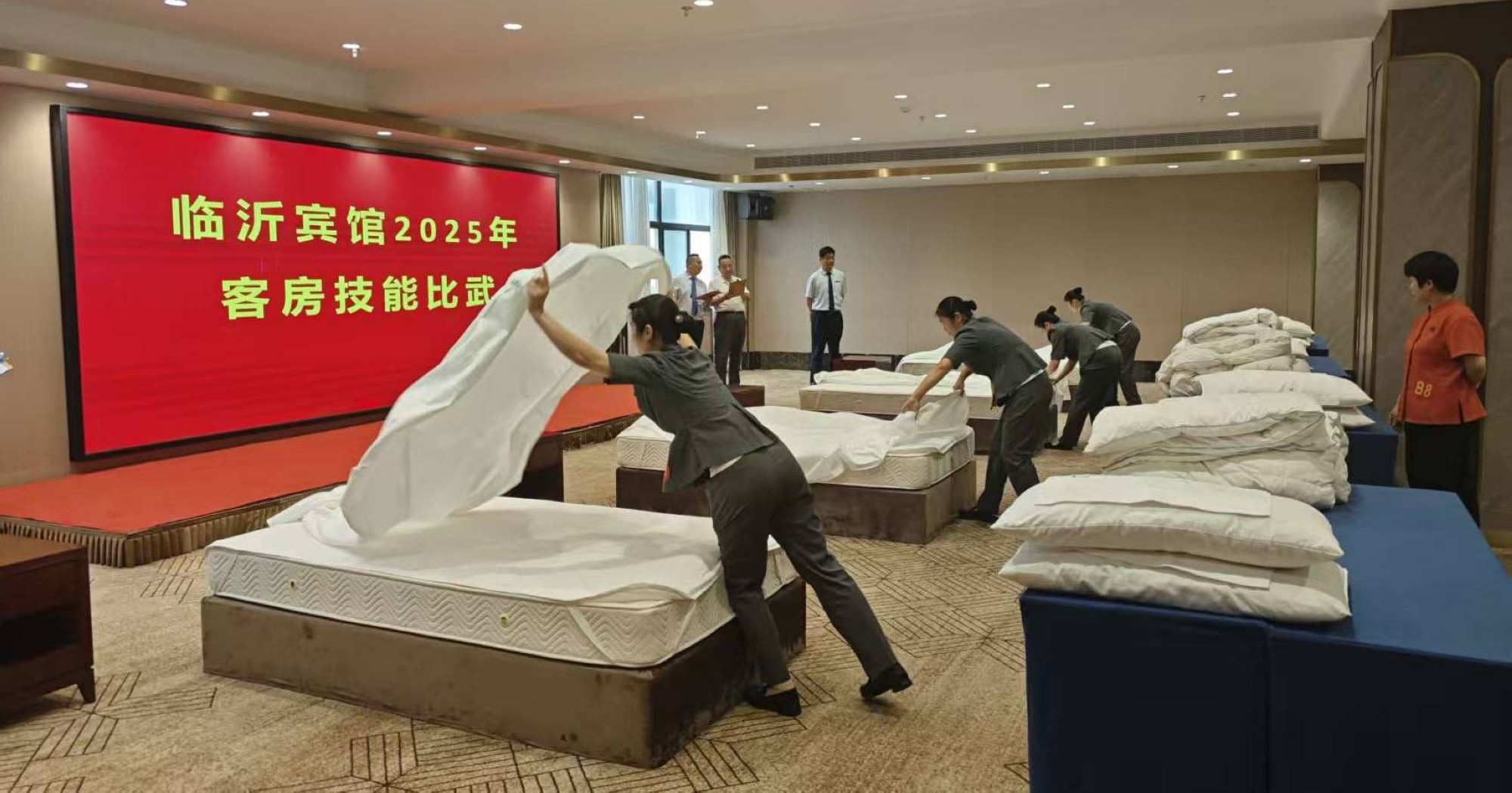 9月28日下午,臨沂賓館中式鋪床技能比武在沂蒙路店貴賓樓多功能廳舉行。本次技能比武分為中式鋪床、開(kāi)夜床兩項(xiàng),共有18名選手參加,以實(shí)操比拼展現(xiàn)服務(wù)專業(yè)素養(yǎng)。