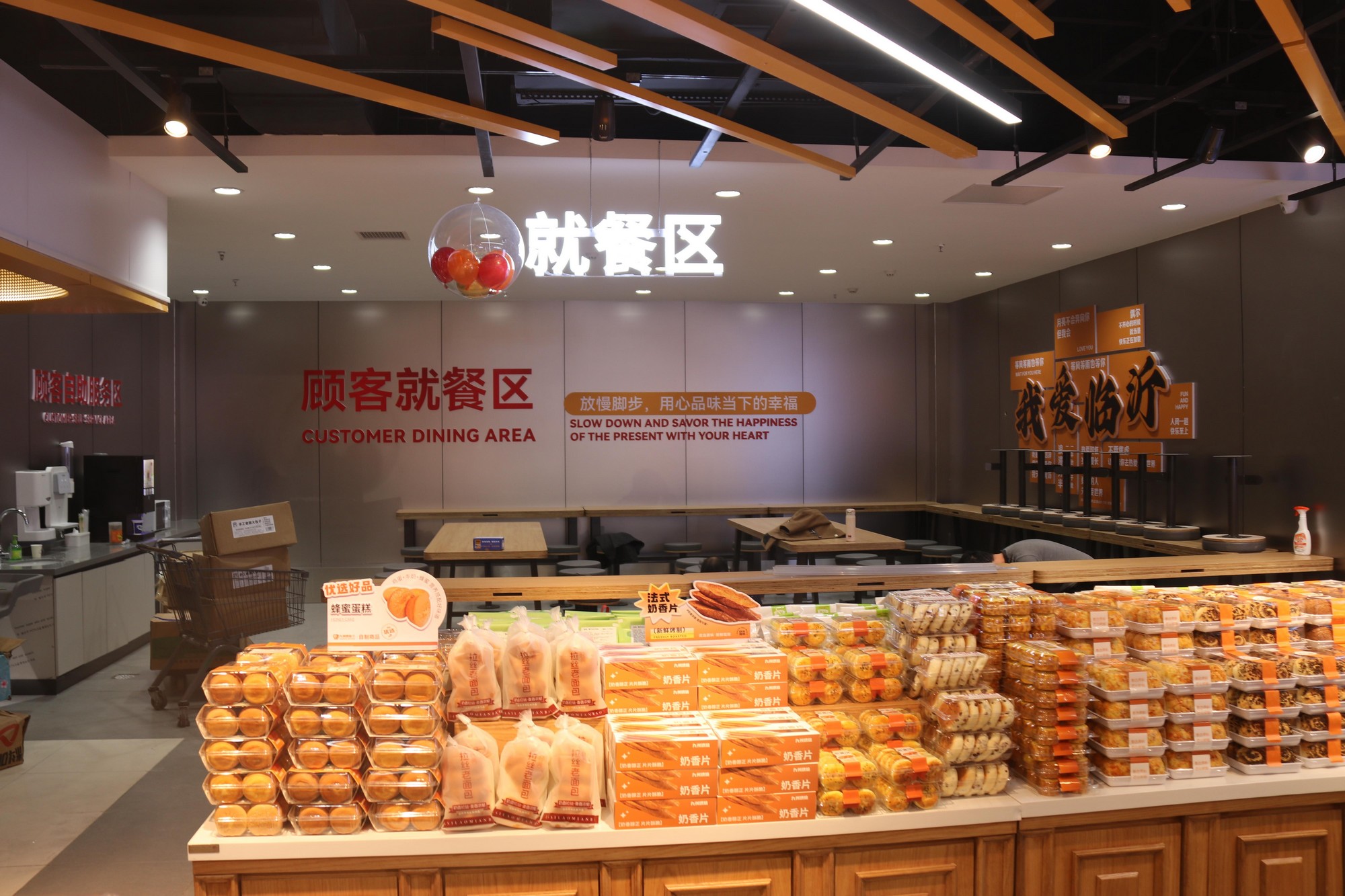 除品類(lèi)擴(kuò)容外,門(mén)店還新增顧客就餐區(qū),打破了“逛”與“吃”的場(chǎng)景邊界,搭配自助咖啡機(jī)、自助豆?jié){機(jī)等服務(wù)設(shè)備,讓消費(fèi)者在購(gòu)物間隙即可便捷享受美食。